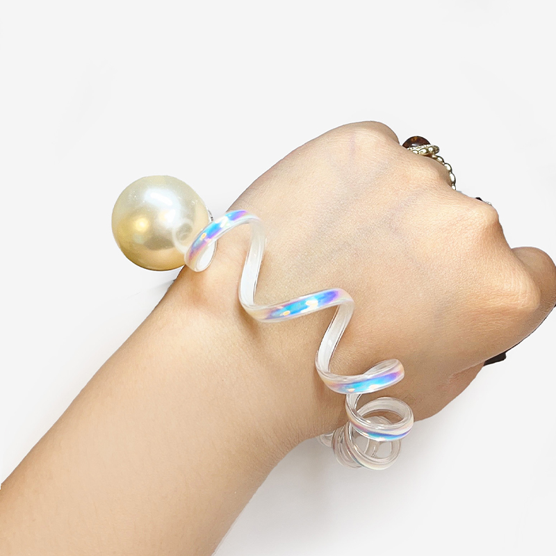 Hairband phone cord iridescent sheen pearl accessory. Then band is holographic and iridescent, and there is a pearl-like decoration to highlight the style. It’s cute, mermaid-like, and fairy, definitely unique. Two different kinds of compositon available.